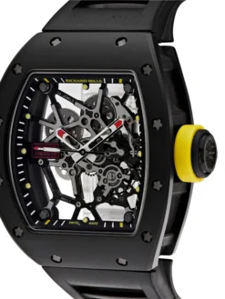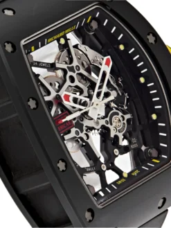 The RM 035 is constructed from advanced materials that ensure durability without compromising comfort. Weighing a fraction of traditional luxury watches, it’s a perfect fit for active individuals who demand reliability and adaptability. The watch case is made of NTPT carbon and brushed titanium, which ensures exceptional strength while maintaining its sleek profile. Tested rigorously to meet the demands of high-pressure environments, this watch stands resilient in both style and function.